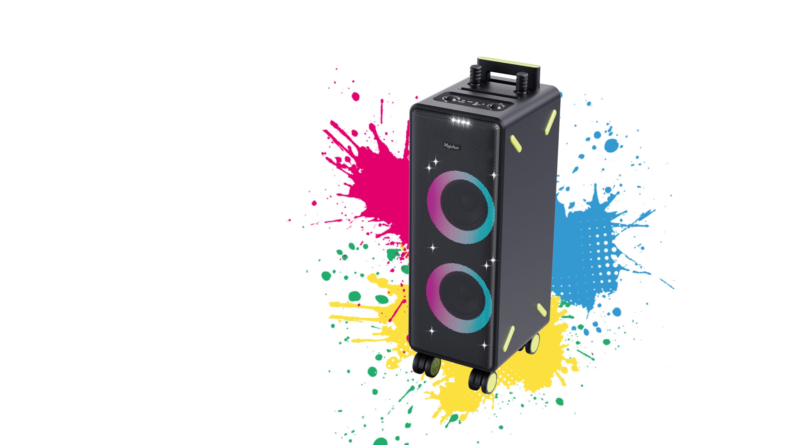 Powerful sound, extra bass, 14 hours play time with powerful sound and big, pumping bass, this karaoke speaker can fill the room with beats. The built-in battery lets you rock the party outdoors for up to 14 hours play time on a single charge. Party light effects, blaze to the music get everyone up and dancing with party light effects! A ring of colored lights on the speaker pulses in time to the music, and there are four different lighting modes to choose from. However you love to party, this speaker has you covered. Mic inputs, karaoke effects a mic input (6.3 mm) lets you take the party up a notch.  Both guitar and mic have their own volume controls on the speaker. You can change your voice, fade vocals, and add echo effects too. mic input (6.3 mm) lets you take the party up a notch